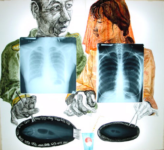 oil, X-ray film and silk on light box