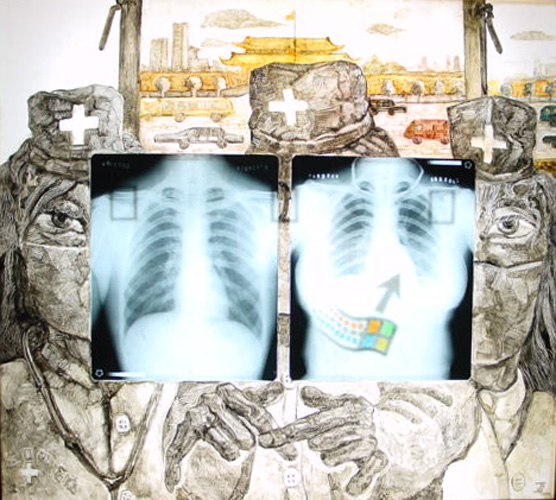oil, X-ray film and silk on light box